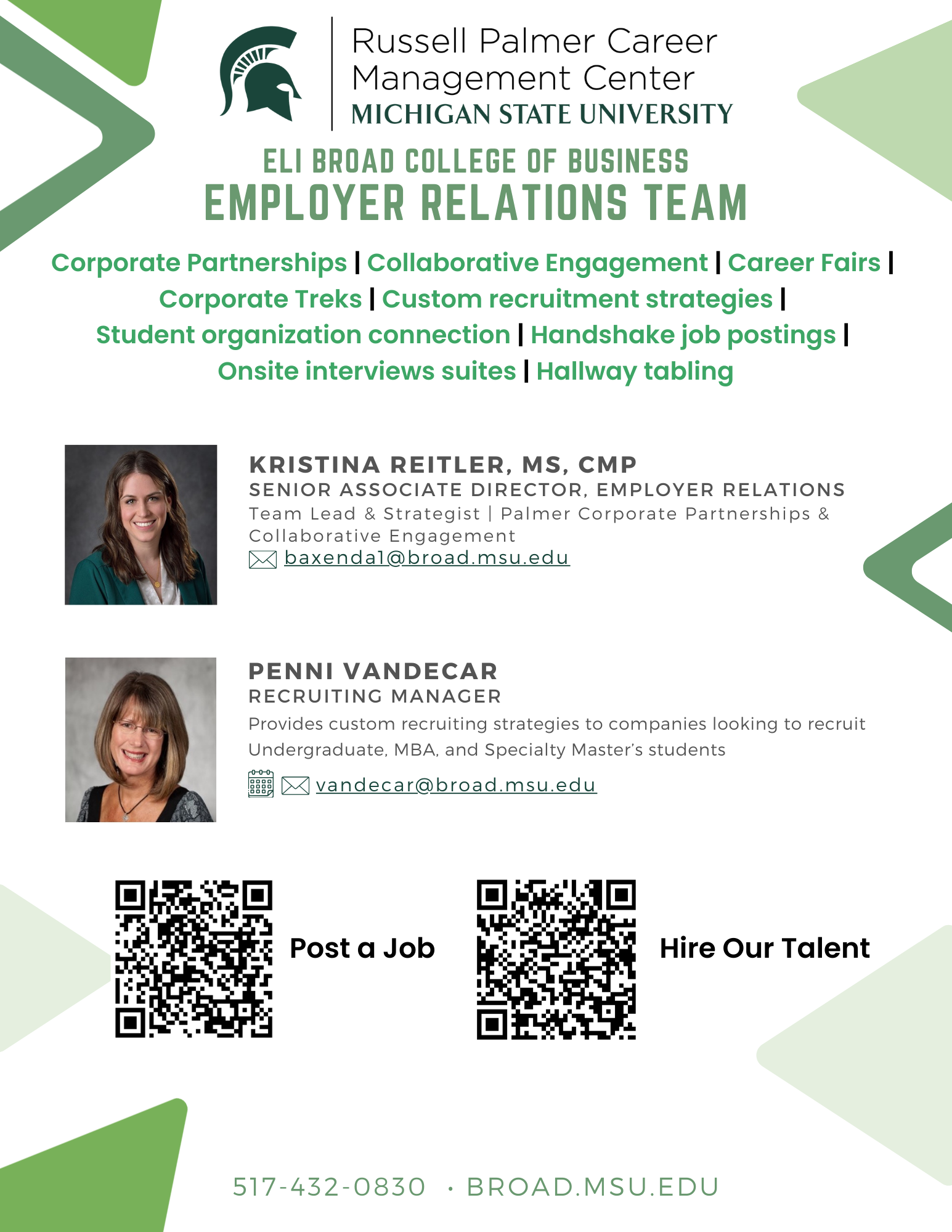 Our employer relations team within the Russell Palmer Career Management Center supports all Broad students: Full-Time MBA, Specialty Master’s and Undergraduate. We are well prepared to build connections between our exceptional undergraduate and graduate students and employers looking to raise the level of talent in their organizations.