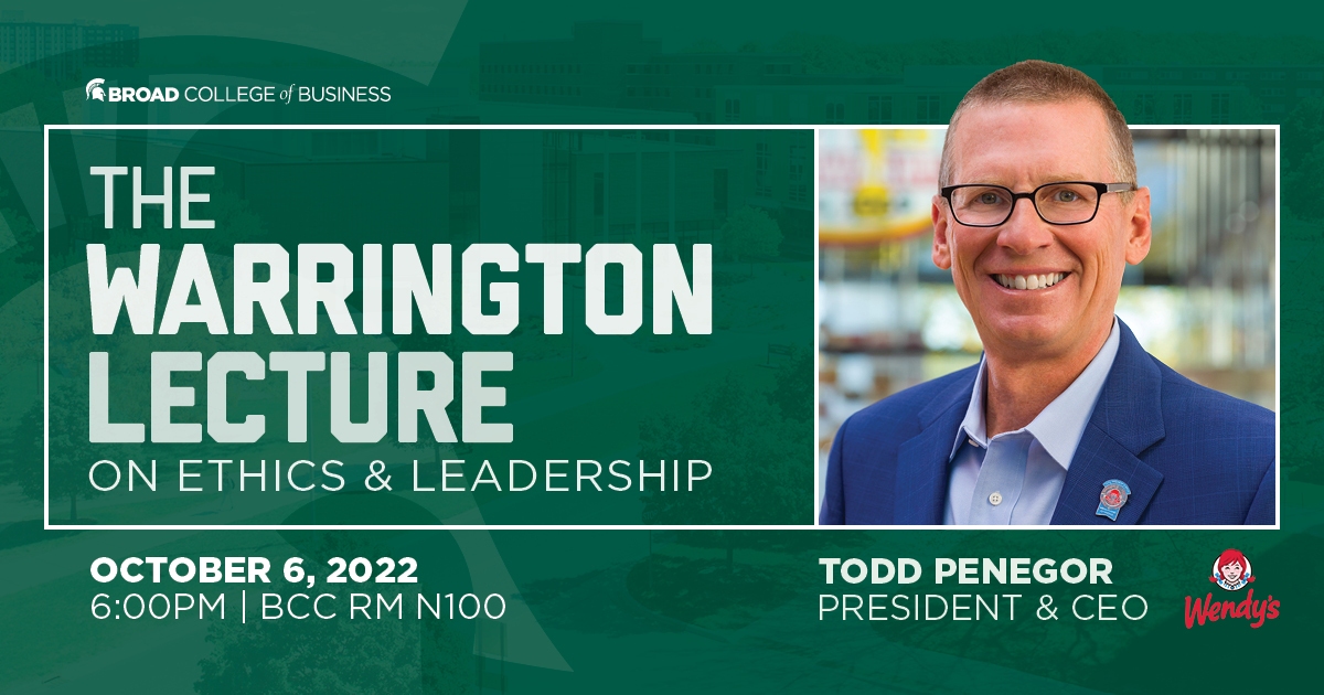 At the annual Sylvan T. Warrington Visiting Lectureship in Ethics and Leadership, we welcome esteemed Broad College alumni back to speak to our community about the convergence of corporate citizenship, strategy, and ethical leadership.