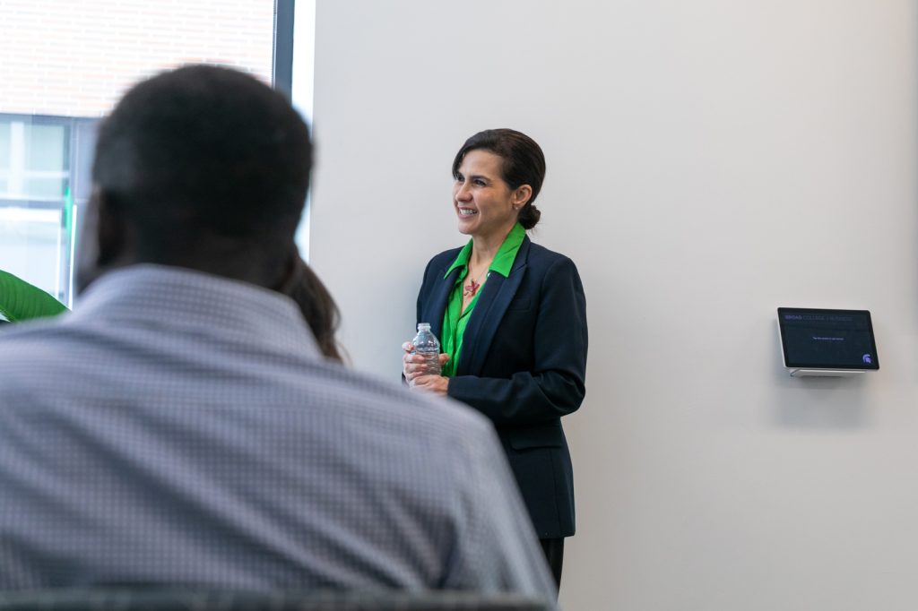 Mejía engaged with faculty and staff during her visit to Broad. My plan to study at MSU was not my plan in the beginning. But I had the opportunity to learn more about what happens when a customer has a specific need or you have adifferent way to provide what the customer is requesting. That’s when I decided to join the supply chain management program. I could see a little bit of the marketing, a little bit of the finance, the logistics, the production and so on. It allowed me to see the full picture of the business. At that time, I was not planning on owning my own business, but in hindsight, it allowed me to see all the little intersections of a company, which has helped me in my day to day.