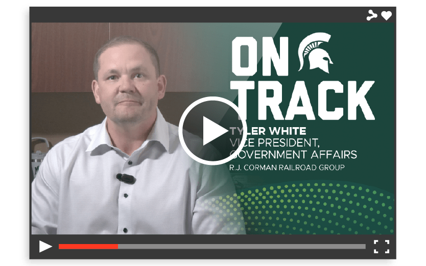 Val Kucherenko, director of the Center for Railway Research & Education chats with Tyler White, Vice President, Government Affairs of R. J. Corman Railroad Group, LLC about his experience completing the Railway Management Certificate Program at Broad College of Business, Michigan State University.